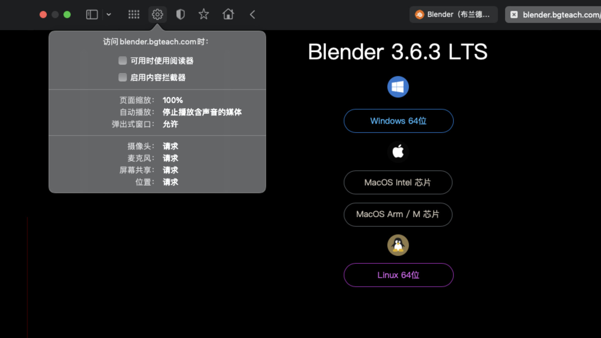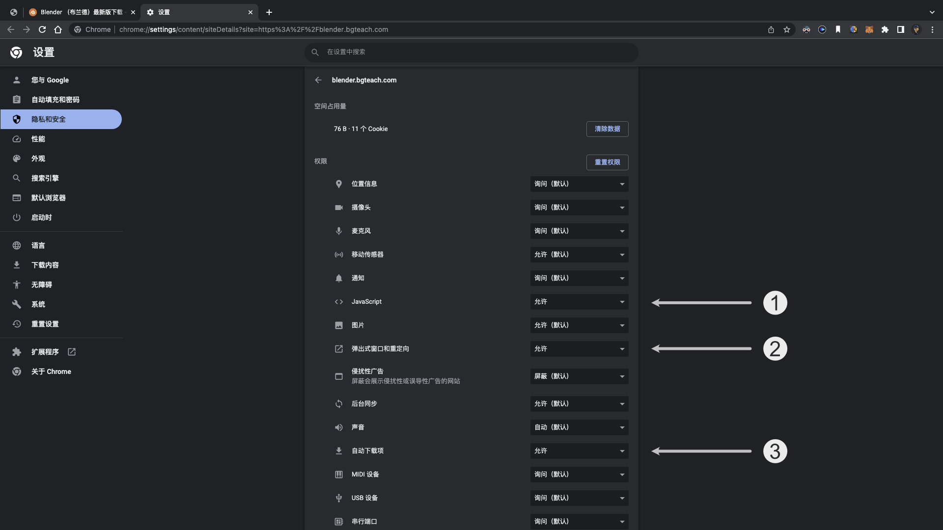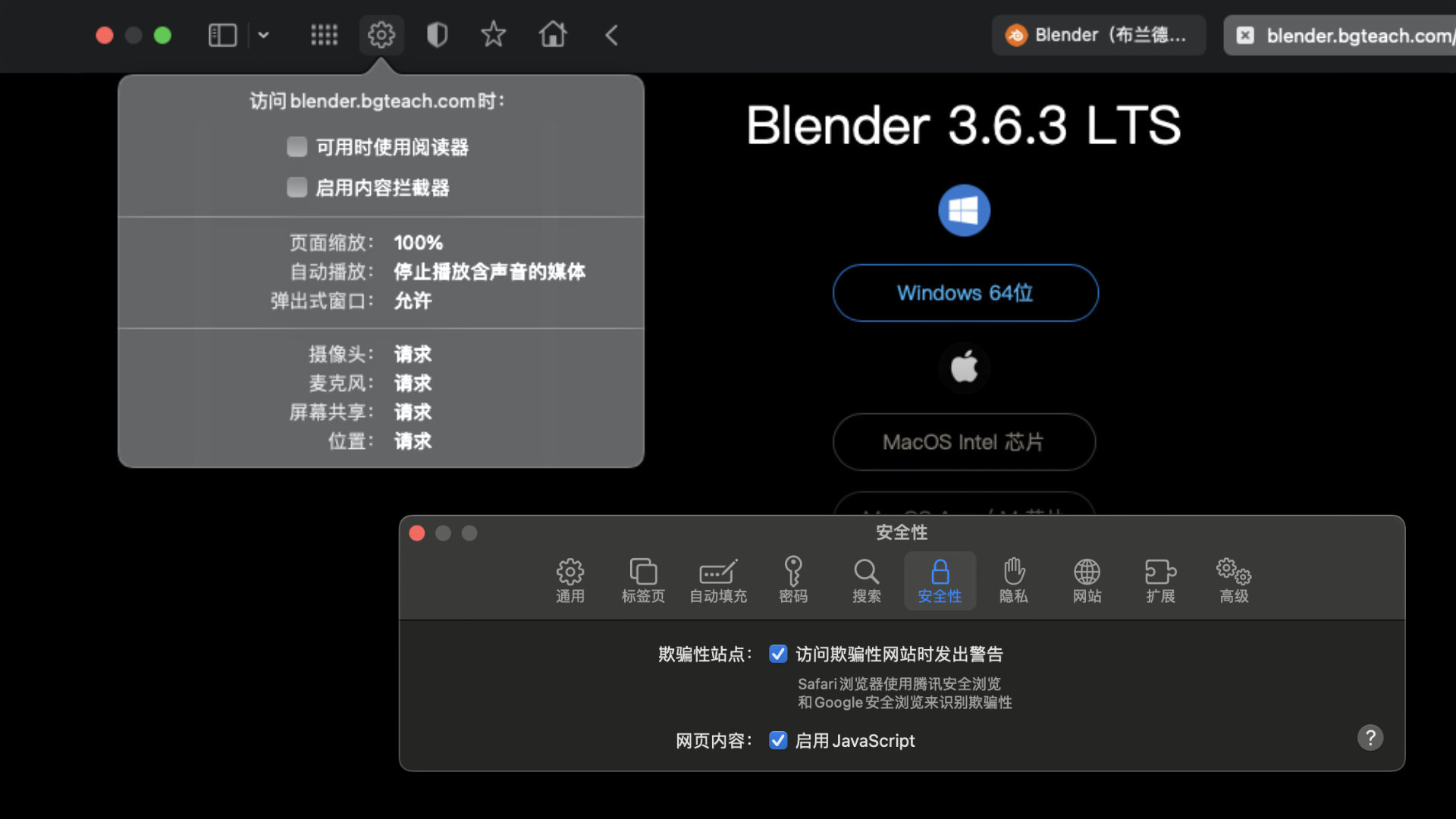请按照上图设置浏览器,也可以在「Safari 浏览器」「blender.bgteach.con 设置」: