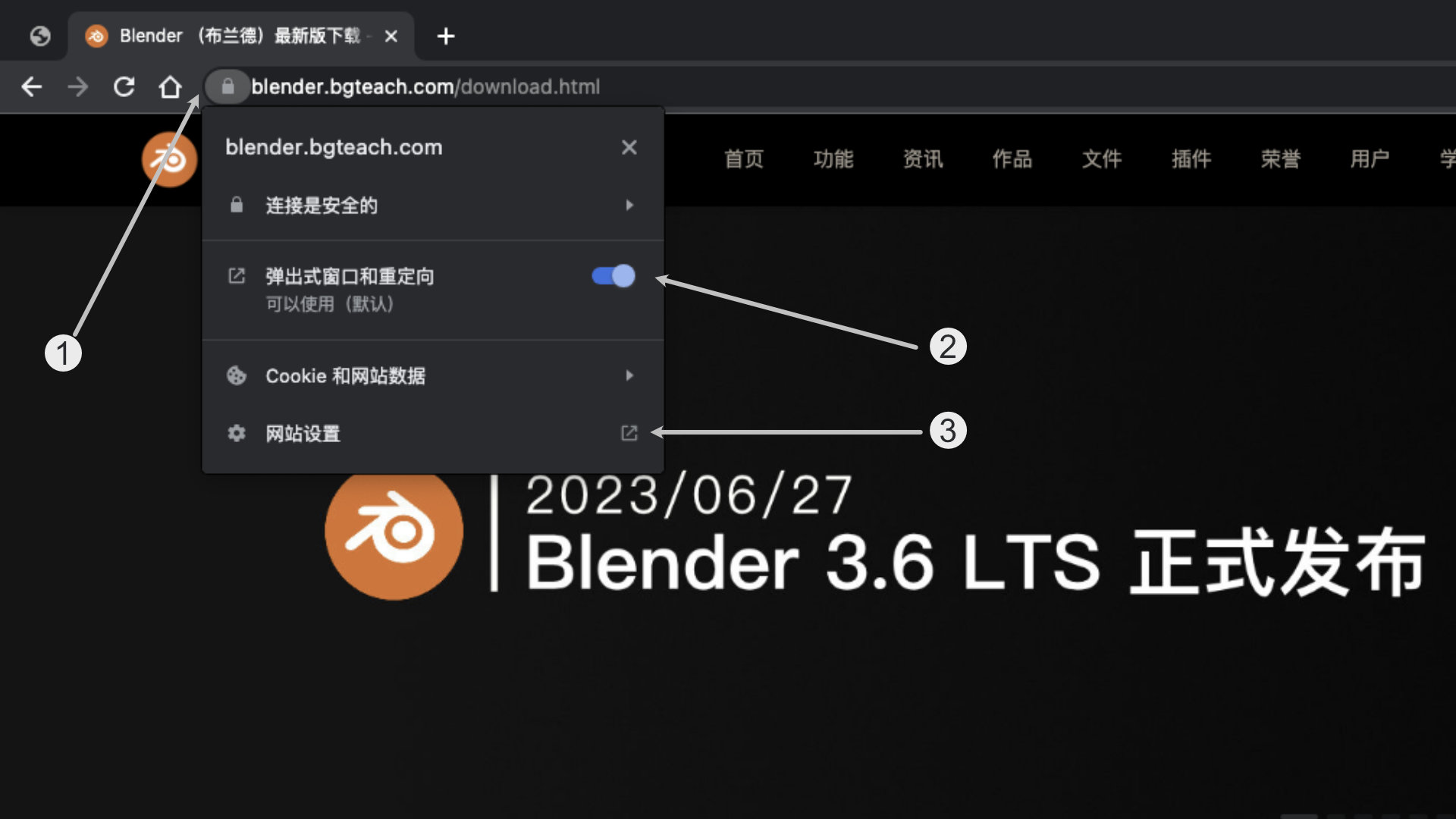 通常情况下,导致无法下载是因为下载链接不是在本站的域名之下,因此,请按照上图指示按照步骤设置浏览器: